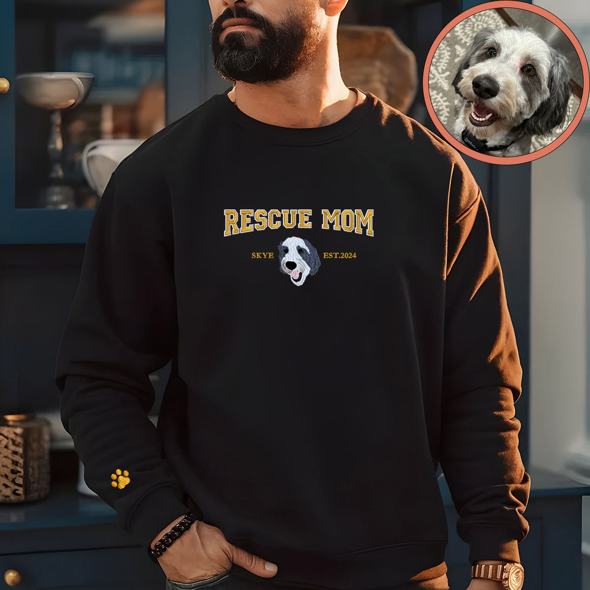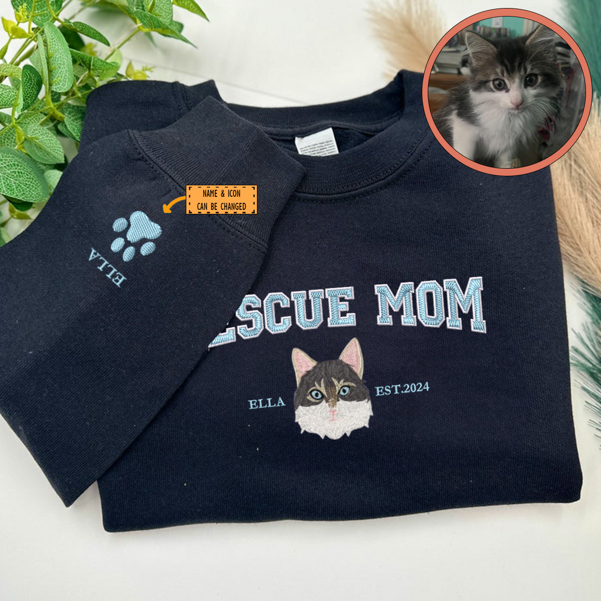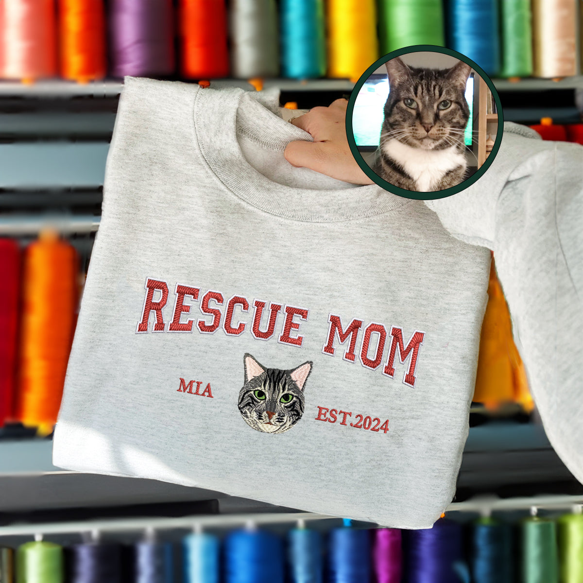 Discover the perfect way to celebrate your unique bond with your pet with our Custom Full-Color Varsity Rescue Mom Embroidered Sweatshirt. Designed for pet parents who cherish their feline friends, this Sweatshirt comes with custom embroidery that showcases a beautiful rendition of your pet. Made from premium materials, it ensures comfort and durability, making it a lasting tribute to your pet. Ideal for pet owners looking for a special gift, our personalized pet Sweatshirt is great for Valentine's Day, Mother's Day, Father's Day, Christmas, or simply to brighten someone's day. Its cozy and sturdy design makes it a cherished item for years, always reminding you of the love you share with your pet.