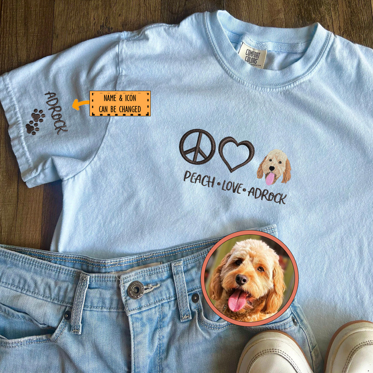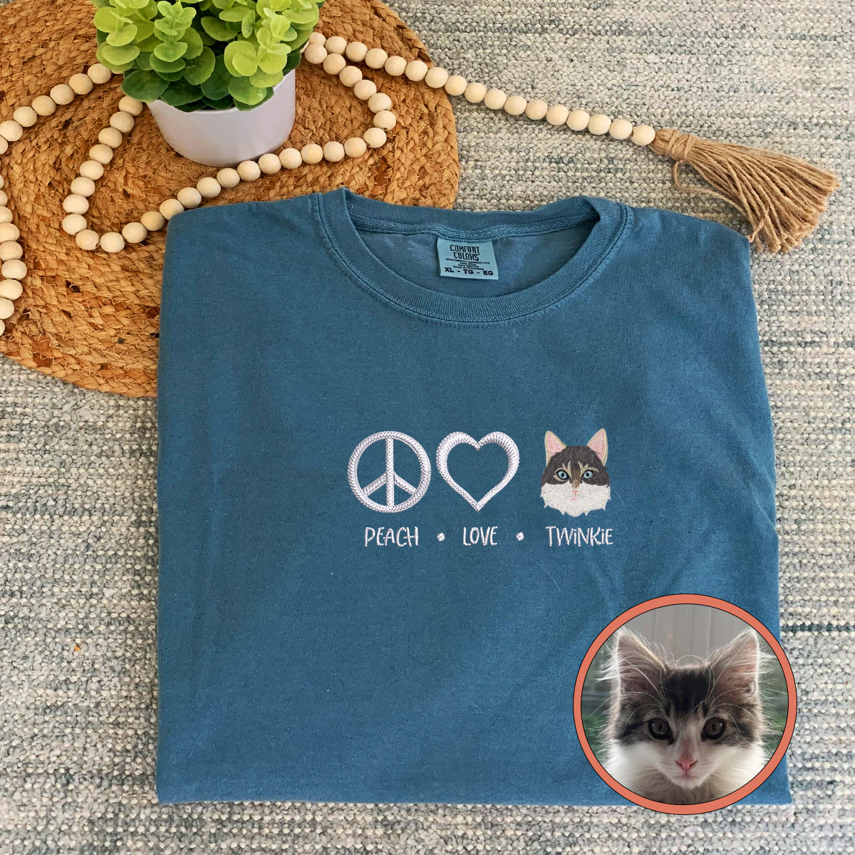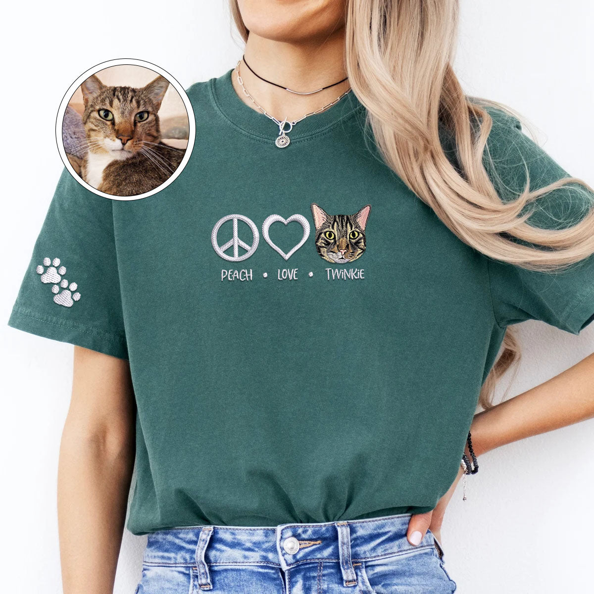 Discover the perfect way to celebrate your unique bond with your pet with our Custom Peace Love Pet With Pet Names Embroidered T-Shirt. Designed for pet parents who cherish their feline friends, this T-Shirt comes with custom embroidery that showcases a beautiful rendition of your pet. Made from premium materials, it ensures comfort and durability, making it a lasting tribute to your pet. Ideal for pet owners looking for a special gift, our personalized pet T-Shirt is great for Valentine's Day, Mother's Day, Father's Day, Christmas, or simply to brighten someone's day. Its cozy and sturdy design makes it a cherished item for years, always reminding you of the love you share with your pet.
